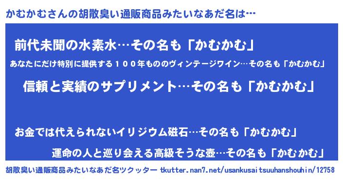 | 男性向けラノベタイトル風あだ名 | 『ダンジョンにかむかむを求めるのは間違っているだろうか』 |