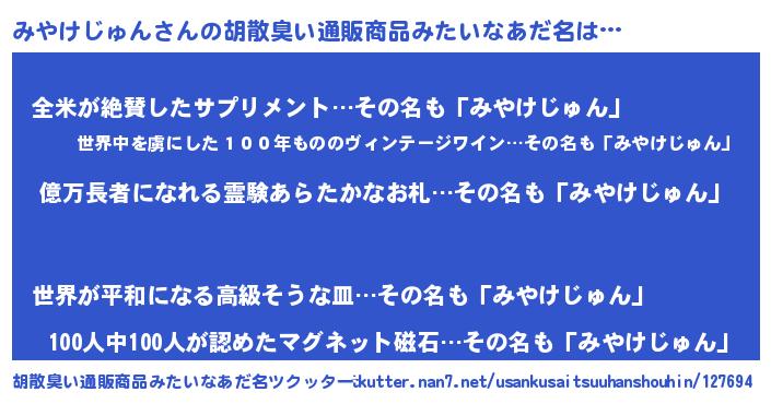 | ヒーロー風カッコイイあだ名 | 『スーパーミヤケジュン』『炎刃騎士ミヤ』 |