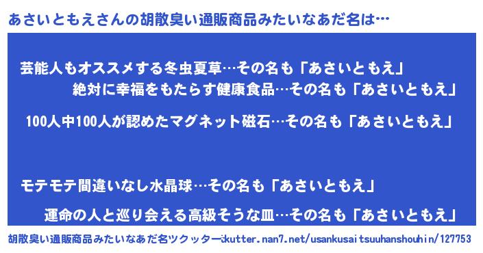| 欧米人風あだ名 | 『アンジェラ・あさいともえ』 |