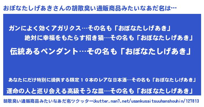 | 男性向けラノベタイトル風あだ名 | 『おぼなたしげあきの嫁は女の子じゃないと思った?』 |