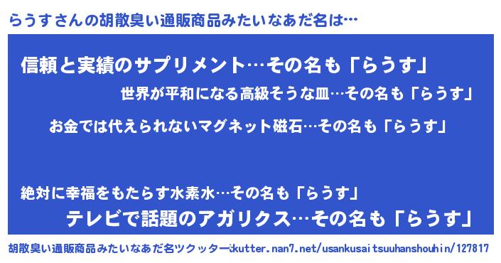 | 意味不明あだ名 | 『眠気覚ましガムらうす味』『自称らうす』 |