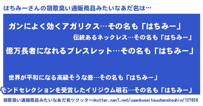 | ヘコむあだ名 | 『はちにー』『はち太郎』『レバニラ』 |