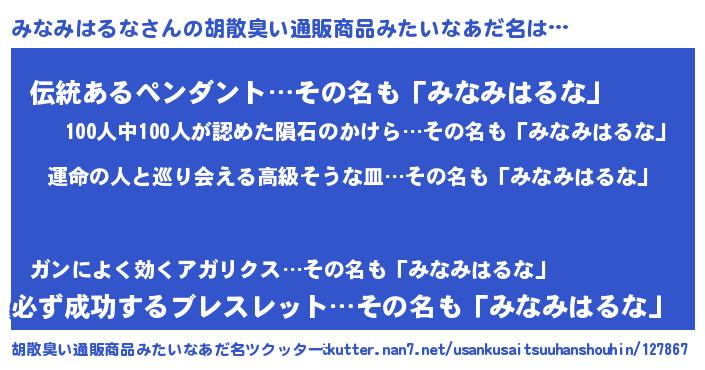 | ポケモン風あだ名 | 『ミナミダネ』『ヒミナミハルナ』 |