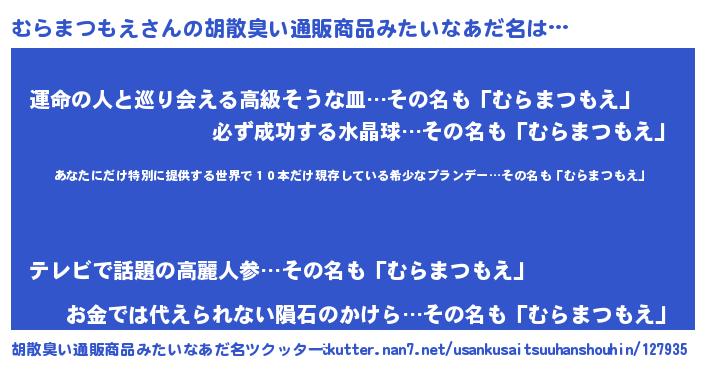 | 男性向けラノベタイトル風あだ名 | 『むらまつもえ~年齢イコール彼女いない歴の魔法使い~』 |