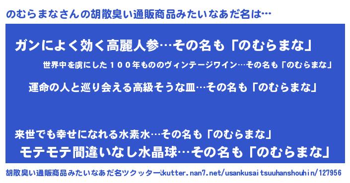 | 男性向けラノベタイトル風あだ名 | 『のむらまなに滅ぼされるだけの簡単なお仕事です』 |