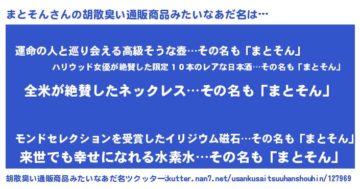 | 男性向けラノベタイトル風あだ名 | 『まとそんに滅ぼされるだけの簡単なお仕事です』 |