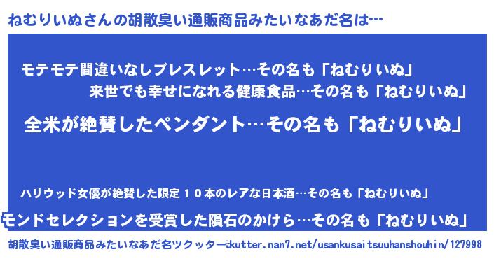 | 意味不明あだ名 | 『とにかく怪しいねむりいぬ』 |