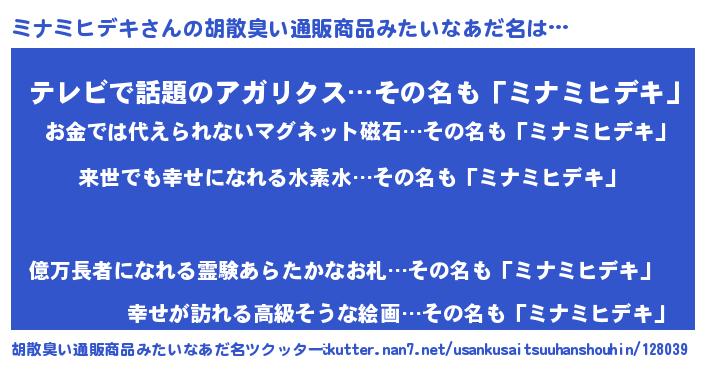 | 意味不明あだ名 | 『永久保存ミナミヒデキ』 |