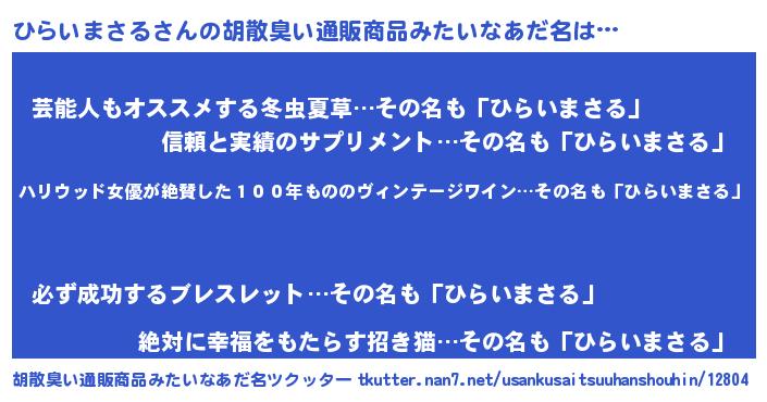 | 意味不明あだ名 | 『住所不定無職ひらいまさる(1歳)』 |