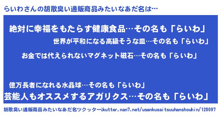 | 意味不明あだ名 | 『眠気覚ましガムらいわ味』『自称らいわ』 |