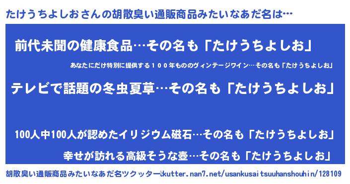 | ヘコむあだ名 | 『たけうちよしお(苦笑)』『酢こんぶ』 |