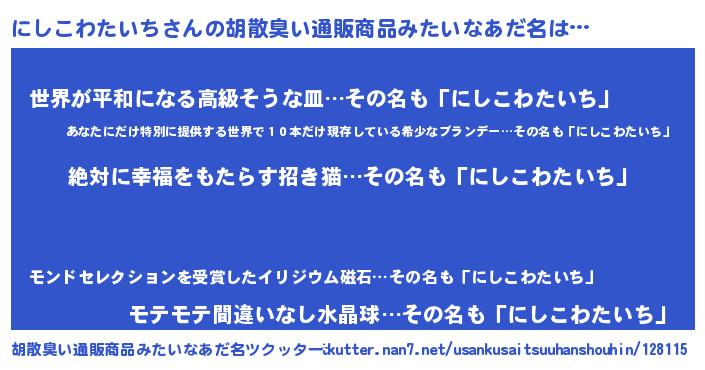 | ヘコむあだ名 | 『にしこわたいち(笑)』『なまこ酢』 |
