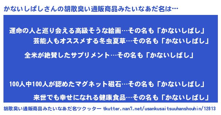 | 男性向けラノベタイトル風あだ名 | 『かないしばしの嫁は女の子じゃないと思った?』 |