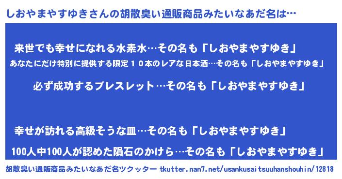 | ヘコむあだ名 | 『しおふぇ~』『しおやまやすゆき(震え声)』 |