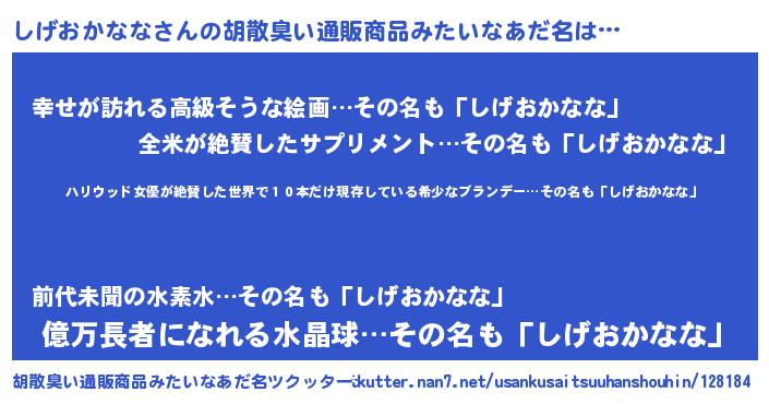 | 意味不明あだ名 | 『住所不定無職しげおかなな(71歳)』 |