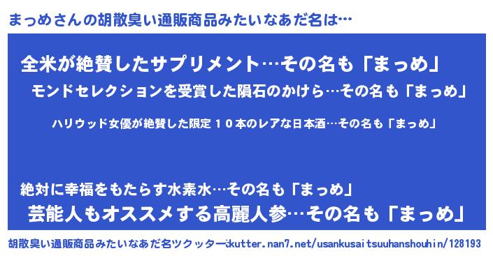 | 意味不明あだ名 | 『めかぶ科まっめ属』『自称まっめ』 |