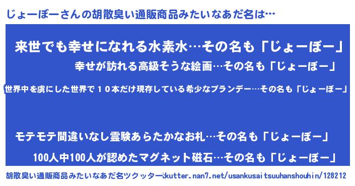 | 意味不明あだ名 | 『住所不定無職じょーぼー(77歳)』 |