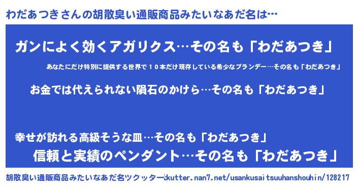 | 男性向けラノベタイトル風あだ名 | 『おまえをオタクにしてやるから、俺をわだあつきにしてくれ! 』 |