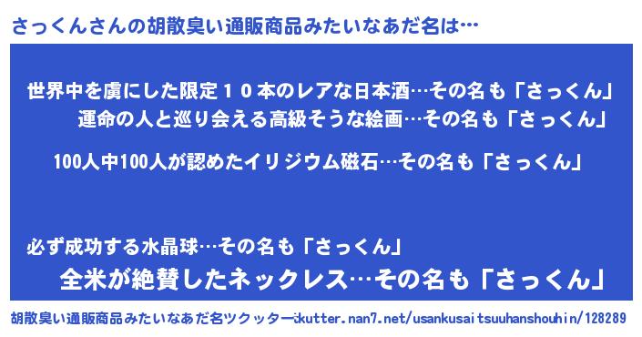 | 男性向けラノベタイトル風あだ名 | 『緋弾のサックン』『魔弾の王とさっくん』 |