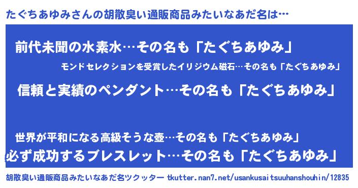 | ヘコむあだ名 | 『たぐっちょ』『たぐちあゆみ(震え声)』 |