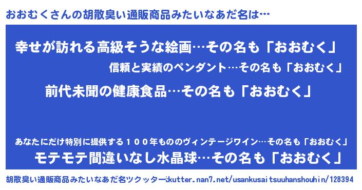 | ヒーロー風カッコイイあだ名 | 『ネオオオムク』『ウルトラおおむくマン』 |