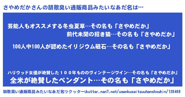 | 男性向けラノベタイトル風あだ名 | 『おまえをオタクにしてやるから、俺をさやめだかにしてくれ! 』 |
