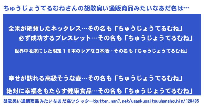 | 意味不明あだ名 | 『住所不定無職ちゅうじょうてるむね(68歳)』 |