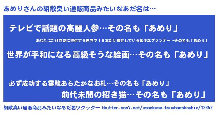 | 意味不明あだ名 | 『あめりフォーエバー』『自称あめり』 |