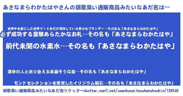 | 男性向けラノベタイトル風あだ名 | 『うちのあさなまらわかたはやが世界を掌握している!』 |