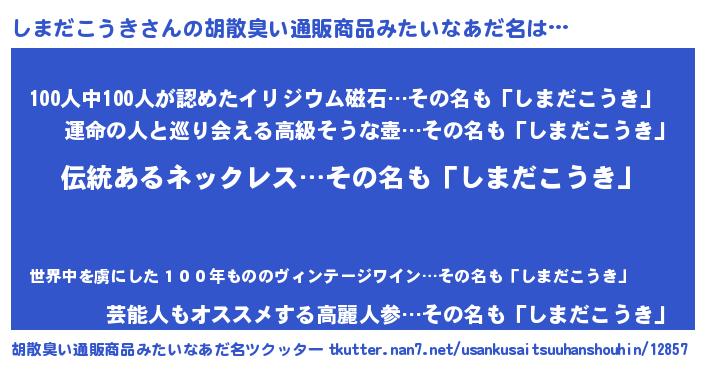 | 男性向けラノベタイトル風あだ名 | 『しまだこうきの嫁は女の子じゃないと思った?』 |