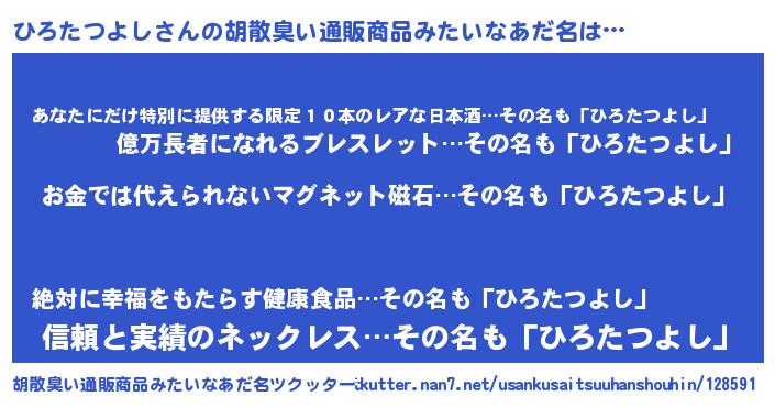 | 男性向けラノベタイトル風あだ名 | 『おまえをオタクにしてやるから、俺をひろたつよしにしてくれ! 』 |