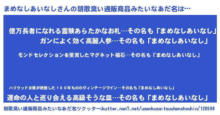 | 男性向けラノベタイトル風あだ名 | 『ノーゲーム・ノーマメナシアイナシ』 |