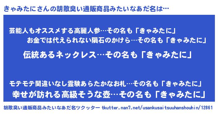 | 男性向けラノベタイトル風あだ名 | 『転生したらきゃみたにだった件』 |