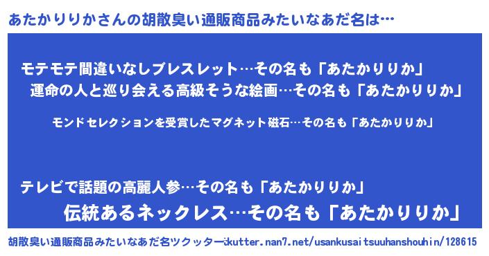 | 男性向けラノベタイトル風あだ名 | 『うちのあたかりりかが世界を掌握している!』 |