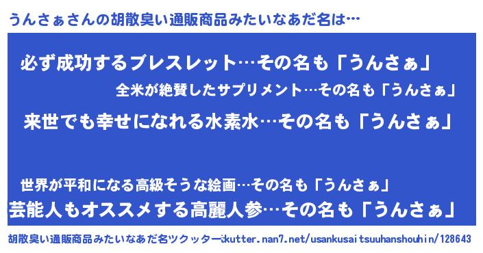 | ヘコむあだ名 | 『うんさぁ(震え声)』『うんふぇ~』 |