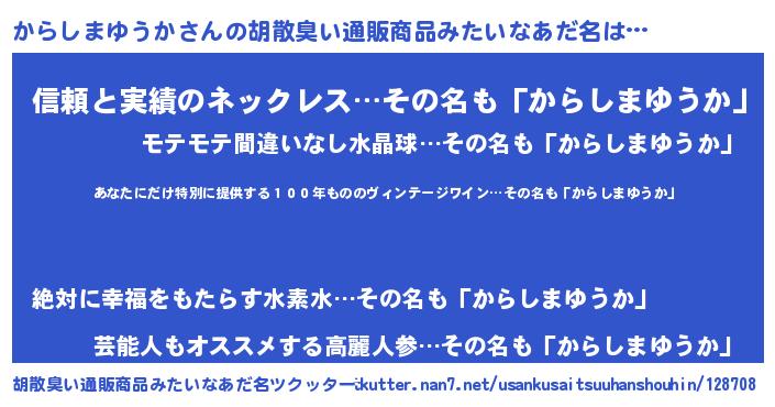 | 意味不明あだ名 | 『住所不定無職からしまゆうか(5歳)』 |