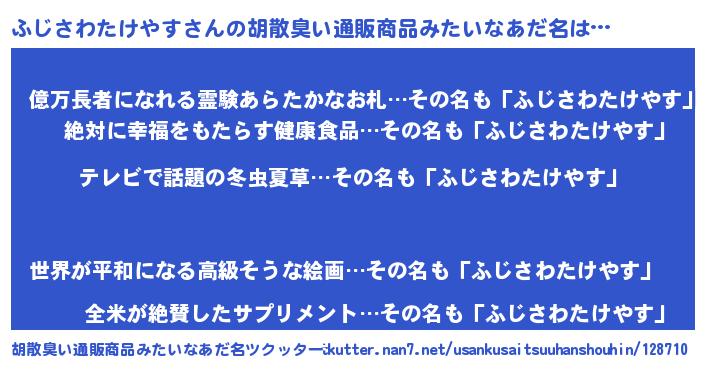 | 男性向けラノベタイトル風あだ名 | 『ふじさわたけやすに滅ぼされるだけの簡単なお仕事です』 |