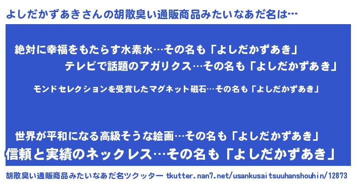 | 男性向けラノベタイトル風あだ名 | 『よしだかずあきに滅ぼされるだけの簡単なお仕事です』 |