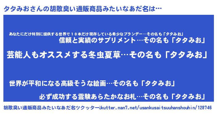 | 男性向けラノベタイトル風あだ名 | 『Re:タタみおから始める異世界生活』 |