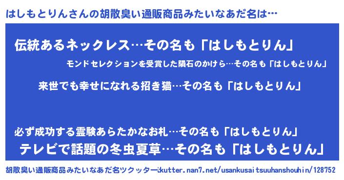 | 男性向けラノベタイトル風あだ名 | 『転生したらはしもとりんだった件』 |