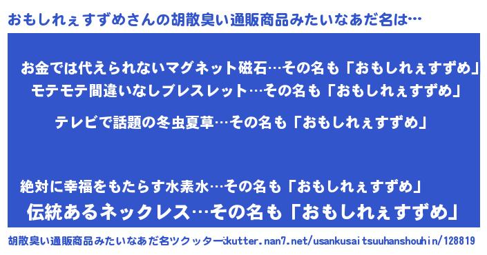 | 男性向けラノベタイトル風あだ名 | 『Re:おもしれぇすずめから始める異世界生活』 |