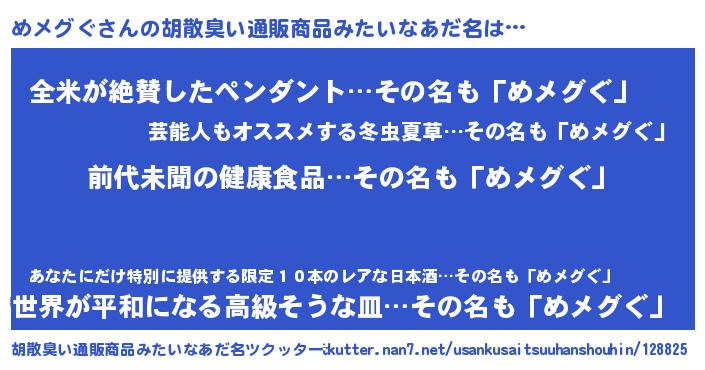 | 意味不明あだ名 | 『永久保存めメグぐ』『自称めメグぐ』 |
