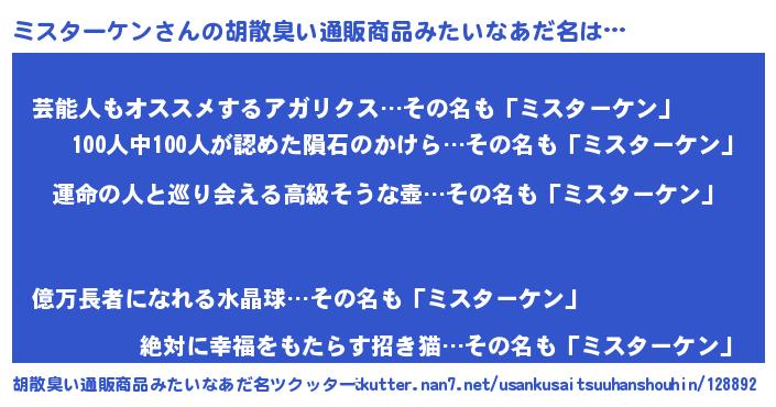 | ヘコむあだ名 | 『酢こんぶ』『ミスターケン(爆)』 |