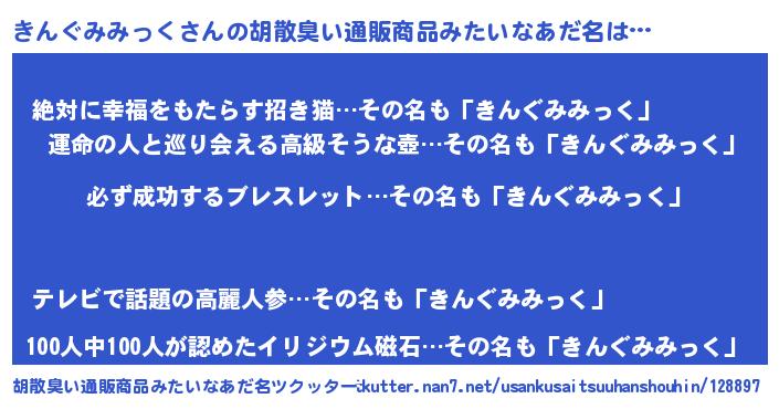 | 女子向けラノベタイトル風あだ名 | 『(仮)きんぐみみっくのやんごとなき事情』 |
