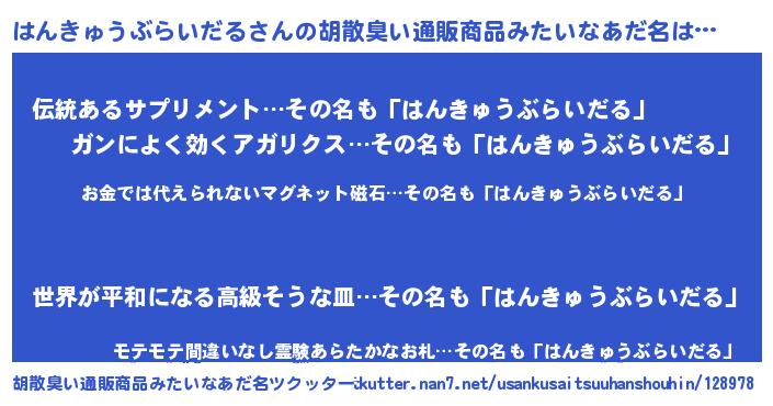 | 女子向けラノベタイトル風あだ名 | 『はんきゅうぶらいだる恋絵巻』 |