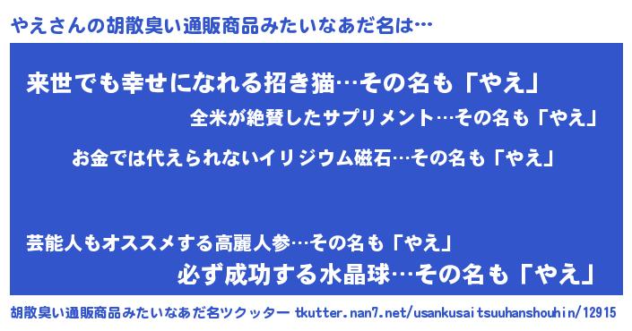 | ヘコむあだ名 | 『やえ(笑)』『やえにー』『やえを』 |
