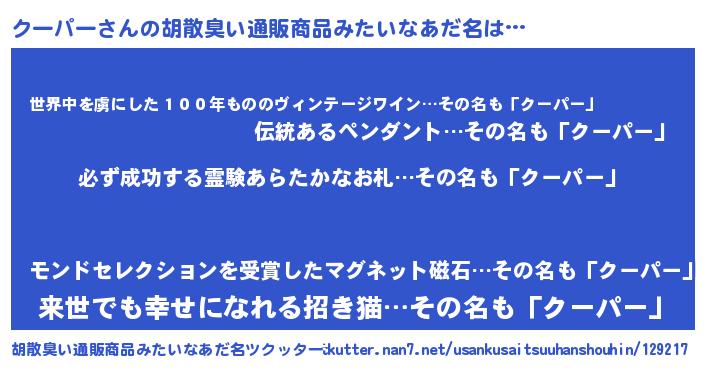 | 男性向けラノベタイトル風あだ名 | 『クーパーの憂鬱』『魔弾の王とクーパー』 |