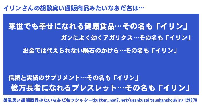 | ヘコむあだ名 | 『イリン(遠い目)』『イリにゅー』 |
