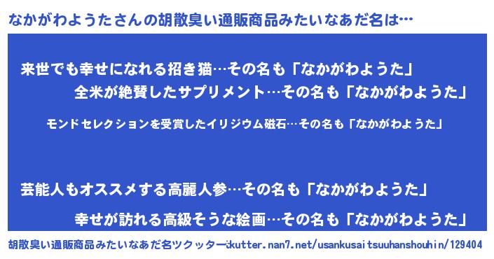 | ヘコむあだ名 | 『なかがわようた(苦笑)』『豆乳』 |