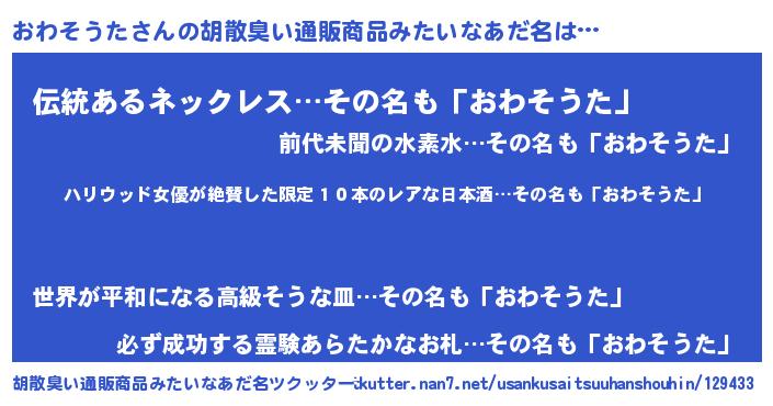 | 意味不明あだ名 | 『住所不定無職おわそうた(62歳)』 |